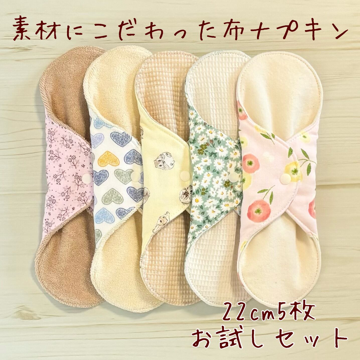 お肌に優しく、安心安全な5種類の肌面素材をお試しいただけるセットです୨୧