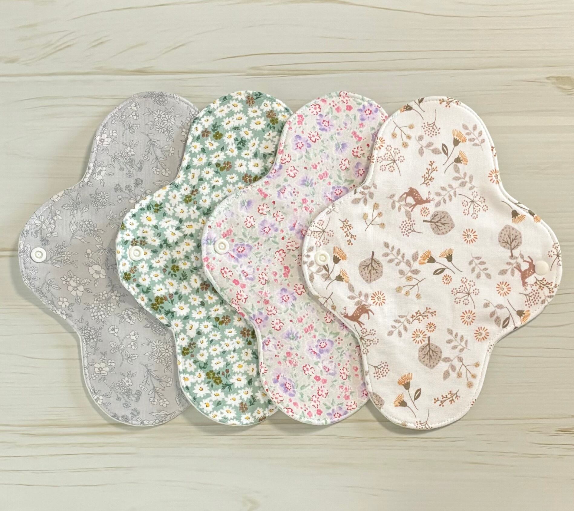 お肌に優しく、安心安全な無添加・無漂白の生地を使用した布ナプキン4枚セットとなります❁