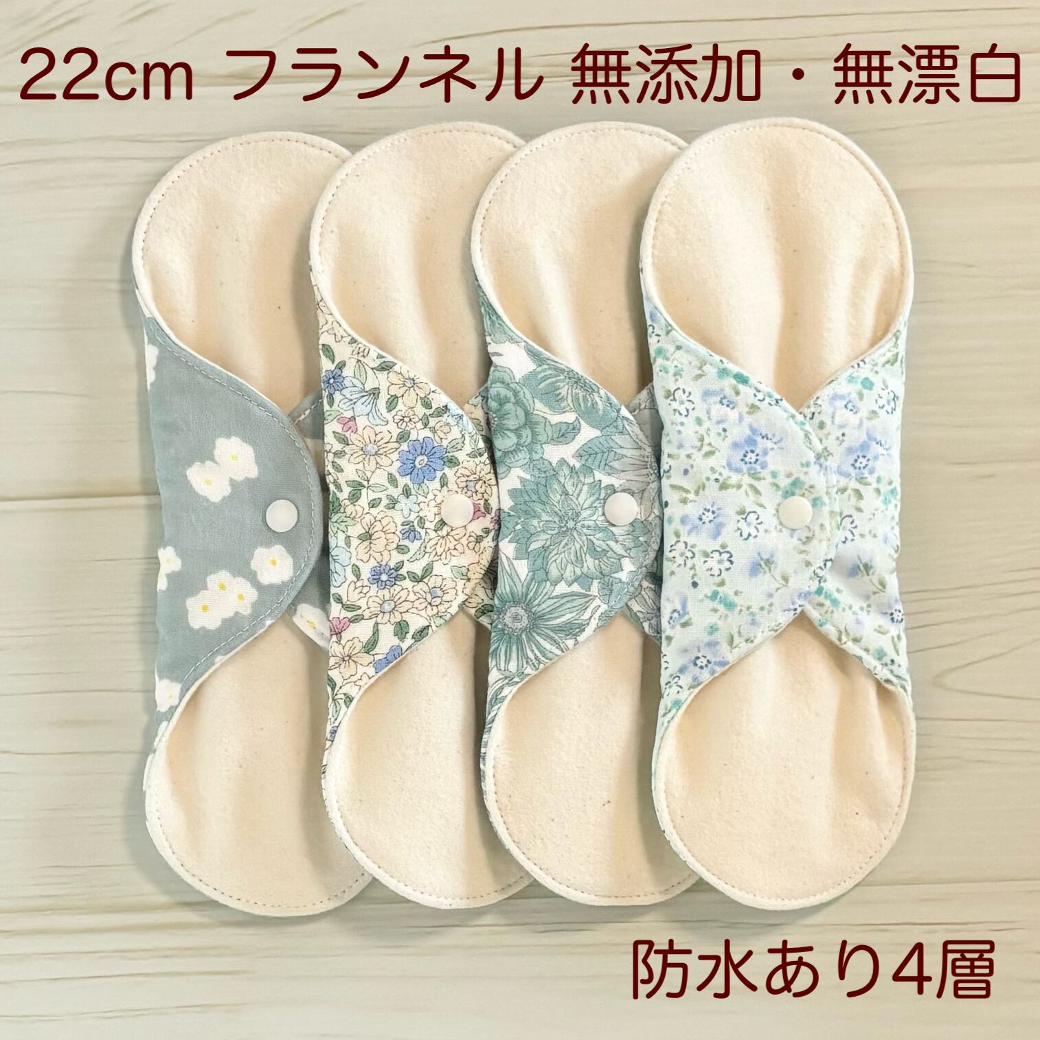 お肌に優しく、安心安全な無添加・無漂白の生地を使用した布ナプキン4枚セットとなります❁