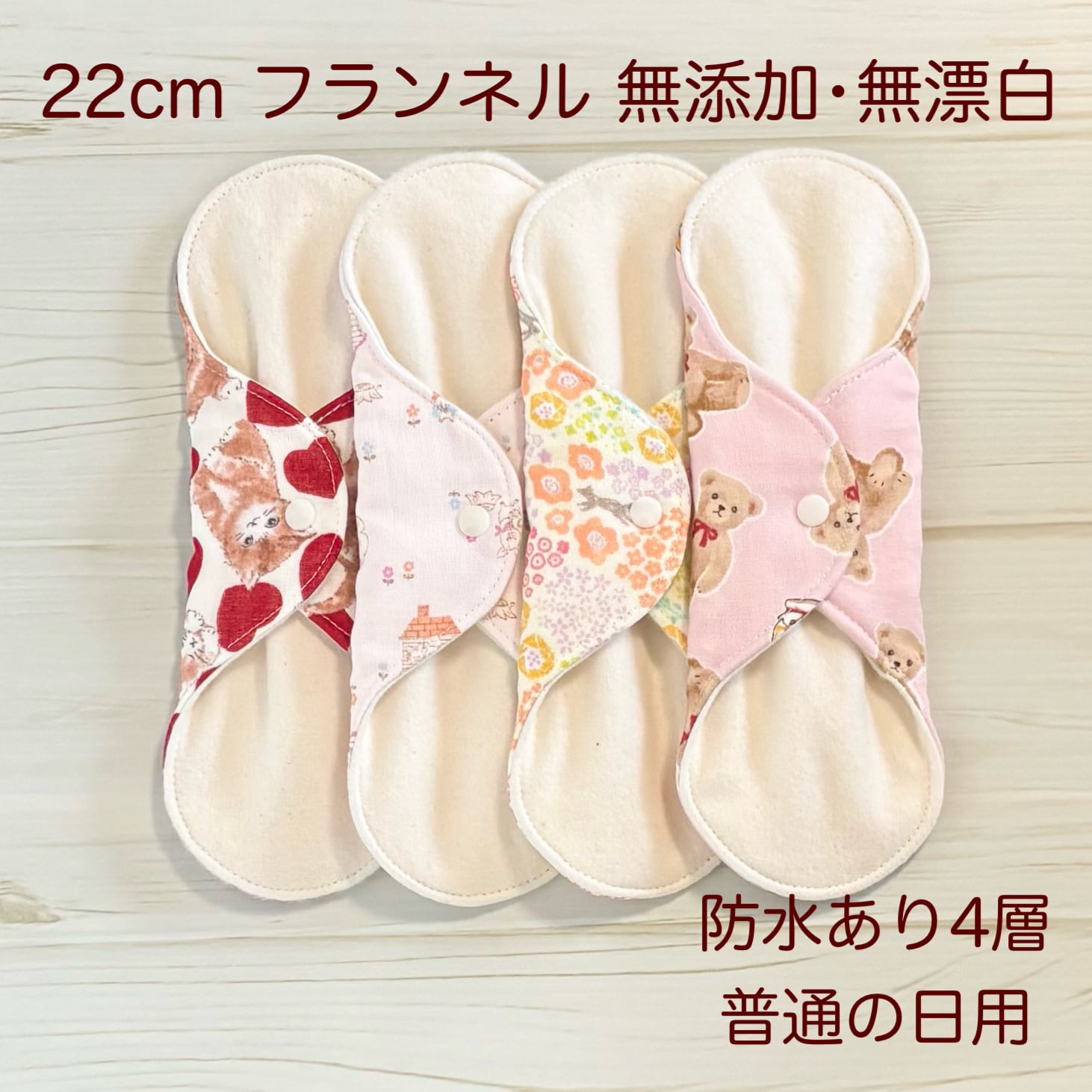 お肌に優しく、安心安全な無添加・無漂白の生地を使用した布ナプキン4枚セットとなります❁